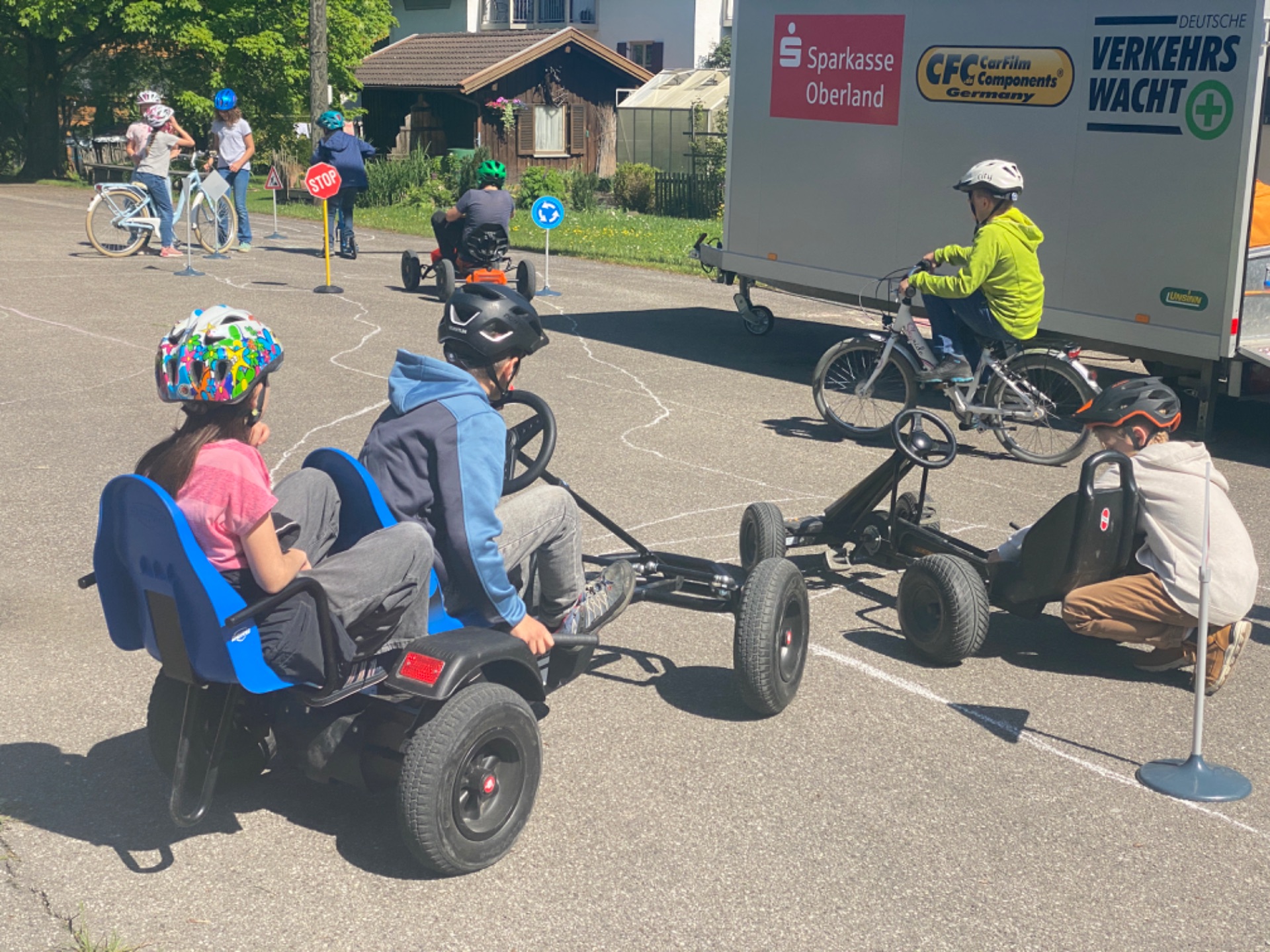 In der Woche vom 26.-30. Mai hatte unsere Schule wieder die Möglichkeit, dank des Schonraumanhängers der uns zur Verfügung gestellt wurde, diverse Verkehrssituationen nachzuspielen. Die Kinder haben fleißig mit Kreide eigene Straßen und Kreisverkehre gemalt, Baustellen aufgebaut. Alles selbstverständlich mit den passenden Verkehrsschildern gekennzeichnet. Auf Rädern, Rollern und Go-Carts wurde der Stockplatz unsicher gemacht. Die selbsternannte Verkehrspolizei hat stets für Ordnung und einen „ruhigen“ Verkehrsfluss gesorgt. Trotz ein paar „Stafzetteln“ hatten alle Kinder stets ein Lachen im Gesicht!
