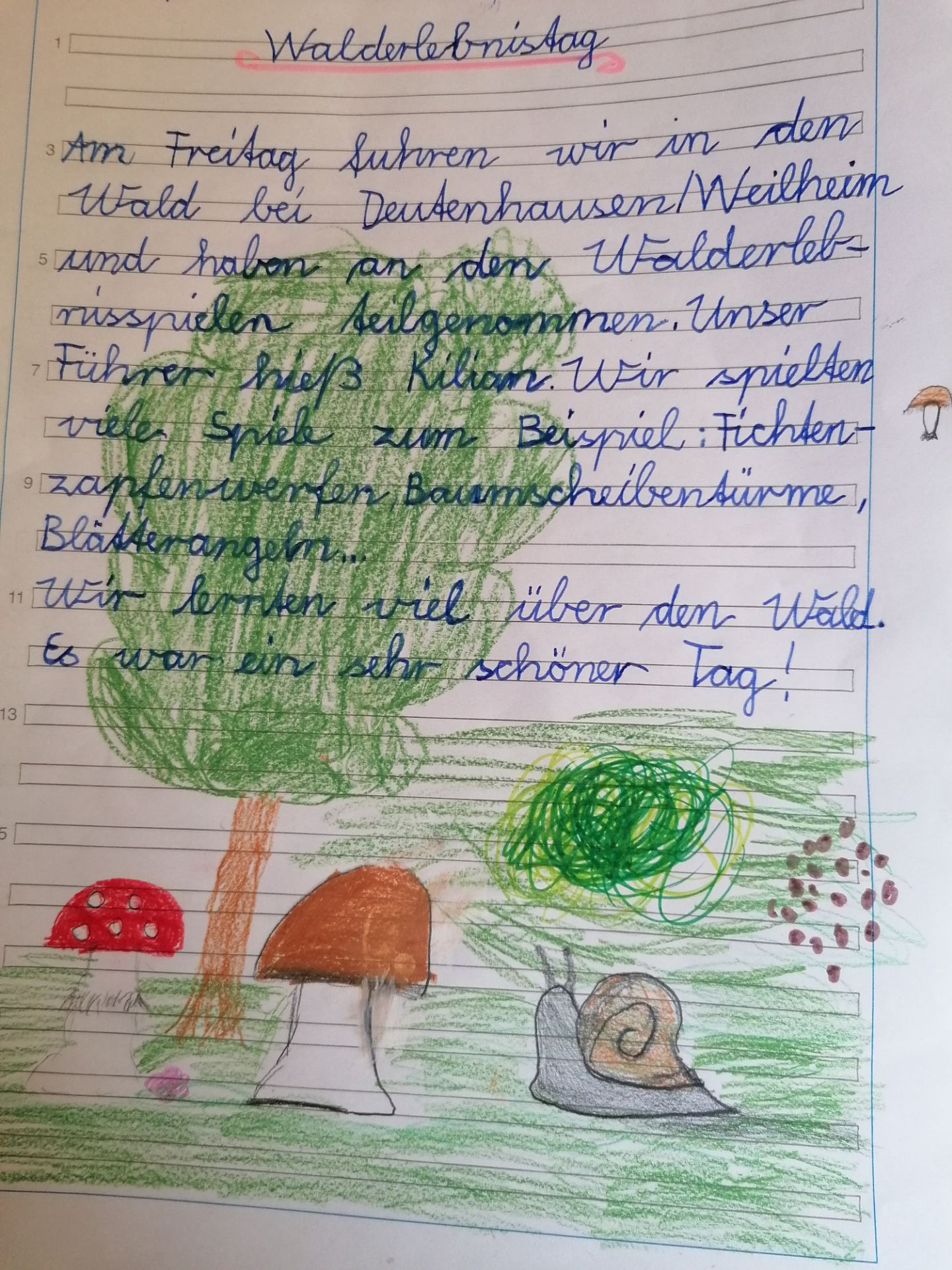 Letzten Freitag, 16.5.25, waren wir im Walderlebniszentrum Weilheim. Wir lernten heute mal anders als im Unterricht. Wir erkundeten die Atomsphäre und spielten viele Spiele. Viele Kinder fanden besondere Stöcke, Wurzeln und Äste und nahmen sie mit nach Hause. Wir hatten eine schöne Zeit. Unser Tipp: Dieser Wald lohnt sich für Groß und Klein.